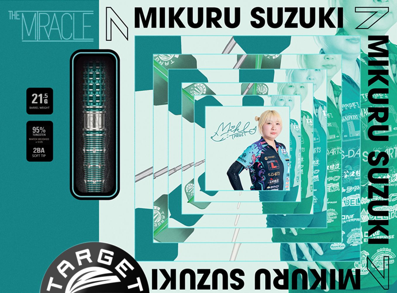 2x World Champion絶対女王、鈴木未来選手モデル THE MIRACLE GENERATION-7世界チャンピオン鈴木未来との共同開発により生まれた「THE MIRACLE」シリーズの最新作。二枚の鏡が映し出す“無限の奥行き”をイメージし、確かな精度と安定感を追求したモデル。無限ミラーを思わせるカットデザイン左右対称に刻まれた細かなカットが連なり、握った瞬間に心地よい感触を生み出す。そのカットが美しい外観と実用的なグリップ性能を兼ね備える。リアグリップ – 安定感のある操作性後方部分には細かな格子状のカットと溝を組み合わせることにより、しっかりとした指掛かりを実現。プレイヤーに安心感をもたらす。フロントグリップ – 指を自然に導くテーパーカット前方部分は段差をつけたテーパー形状にリングカットを施し、指が自然に収まるように設計。スムーズなリリースを助け前方寄りのグリップにも対応。ライトグリーンコーティング鮮やかなライトグリーンのコーティングを施し見た目の美しさと耐久性を両立。鮮烈で清涼感のあるカラーが特長。THE MIRACLE G7 – 美しさと実力を兼ね備えた 1 本細部までこだわり抜いたデザインと安定した投げ心地に。シグネチャーシリーズ 用スタイリッシュ缶ボックスシグネチャーシリーズ専用のスタイリッシュ缶ボックスにダーツが収納されます。アクセサリーやダーツの収納にも便利な缶ケースとして使用できます。NEW ポイントガード–多機能デザインで持ち運びからディスプレイまでサポートダーツポイントを保護するだけでなくダーツスタンドとしても使用が可能。背面には2つの専用ホールが設けられ、手持ちの2BAソフトチップを差し込むだけで安定したスタンドに早変わり。フルセッティングを美しくスタイリッシュにディスプレイできます。トップ部には、予備のソフトチップや K-FLEX の収納が可能。実用性にも優れ、試合や遠征時の心強いパートナーへと様変わり。公式オンラインショップ予約特典9月5日(金)10時までにご注文をいただいた場合、非売品ダーツライブカードをプレゼント!(数量限定)